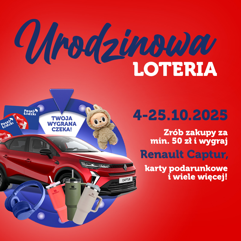 Pasaż Łódzki zaprasza do wyjątkowej urodzinowej loterii, w której na uczestników czeka szansa na wygranie nowego samochodu Renault Captur, a także karty podarunkowe oraz atrakcyjne gadżety.